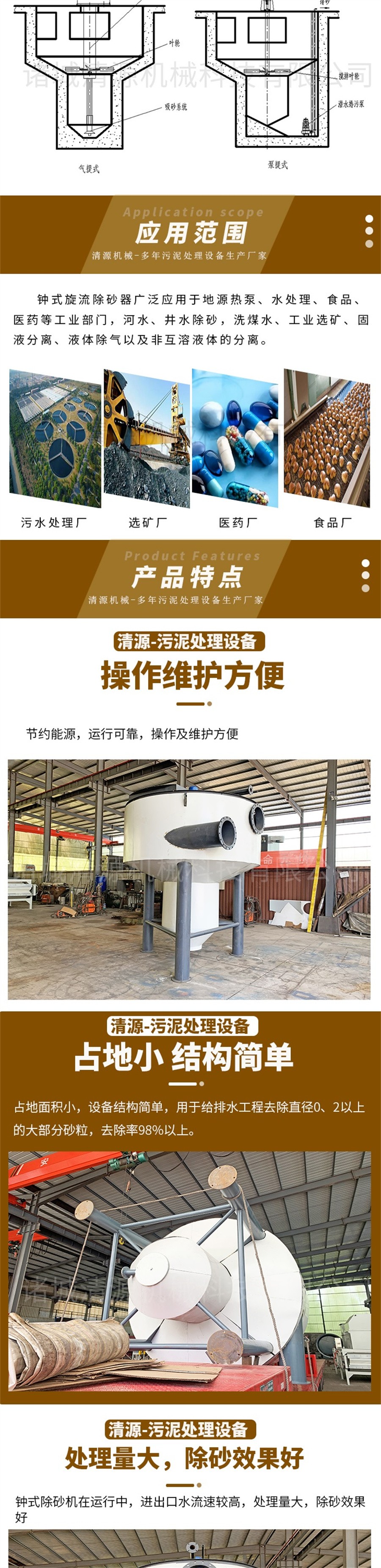 我公司除生產鐘式旋流除砂機外還生產洗砂污水處理設備,地埋式污水處理設備,生活污水處理設備,氣浮機,真空帶式過濾機,污泥壓濾機等其他環(huán)保設備。